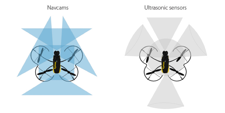 Vistas laterales (y/o girar la cámara principal) y vuelo paralelo a lo largo de los objetos